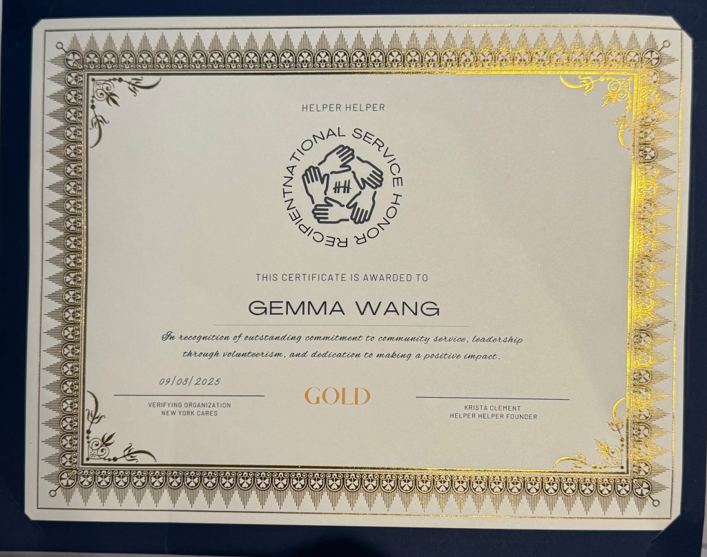 In June of 2025, I was awarded the National Service Honor for the 100 hours of volunteer service I completed over my freshman year, in qualification for the Presidential Volunteer Service Award. I was honored to be recognized for my commitment to community service, leadership through volunteerism, and dedication to making a positive impact!